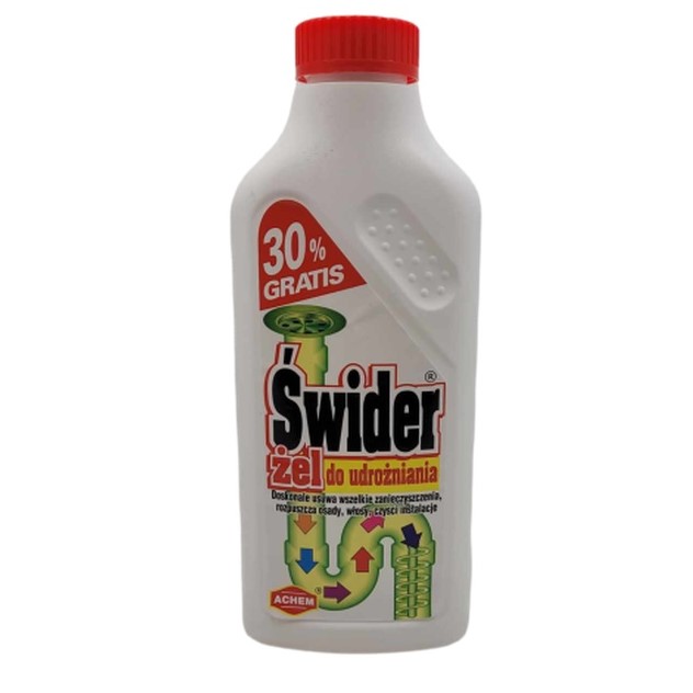 Świder żel do udrożniania rur to skuteczny i łatwy w użyciu produkt do usuwania zatorów w rurach kanalizacyjnych. Żel jest gęsty, działa szybko i jest bezpieczny dla rur.
